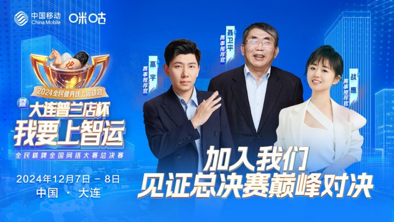 12月7日,2024全民健身线上运动会暨“大连普兰店杯”我要上智运·全民棋牌全国网络大赛总决赛将在风景秀丽的大连普兰店区火热开赛。本次大赛由国家体育总局群体司、中华全国体育总会群体部、国家体育总局棋牌运动管理中心和中国移动咪咕公司共同主办,并由咪咕互动娱乐有限公司、大连市普兰店区人民政府以及中国移动通信集团辽宁有限公司大连分公司联合承办,旨在共同打造全民棋牌赛事盛会。