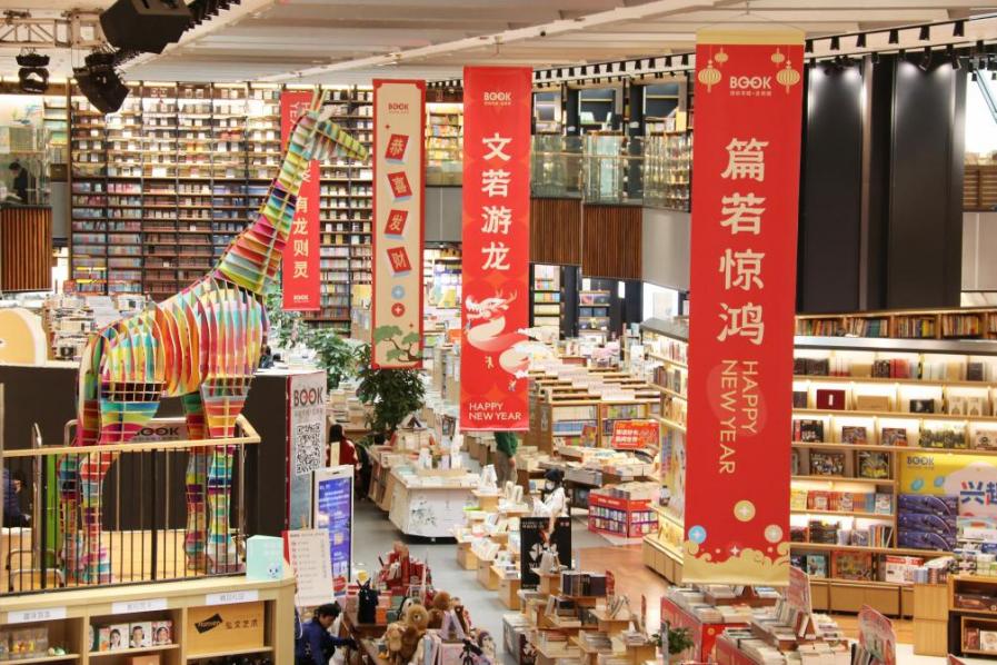 为了喜迎新春,六大深圳书城打造国潮民俗消费新场景,布置不少“龙”元素的精美文创和新潮装饰,营造了浓浓的年味儿。深圳书城中心城推出“寻年俗好物,享红火中国年——藏在梯田里的年味市集”,精选近千种传统年历及年俗饰品,还推出“青绿千载,只此一卷——《千里江山图》一幅传世名画”主题展、“2024,迎粲然新春”主题展等特色展览,为市民备足了文化“年货”。南山城在各楼层设计打卡点,推出万事兴“龙”国潮主题展、“欣欣向龙”年货街、“龙头马面 我享霓裳——国潮汉服”主题展、“龙蕴华彩 国风美学——文物里的艺术新年”主题展等“龙”系列主题展览,可读、可逛、可赏、可淘,满足市民一站式需求。