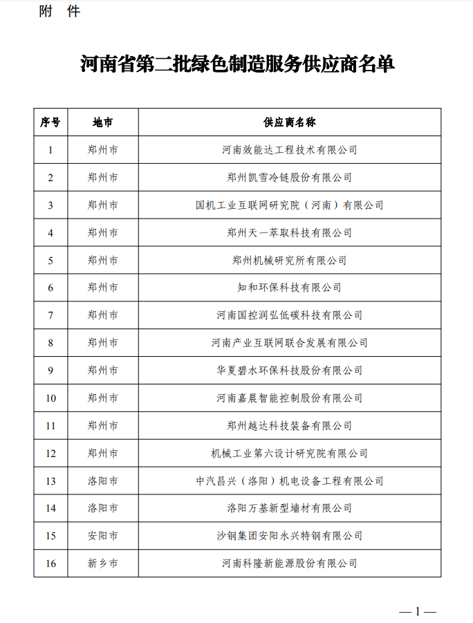 据河南省工业和信息化厅消息,按照《河南省工业和信息化厅办公室关于组织遴选第二批绿色制造服务供应商的通知》(豫工信办节〔2024〕18号)要求,经企业自主申报、各地工信部门推荐、专家评审、网上公示等程序,该厅确定了河南省第二批绿色制造服务供应商名单(见附件),现予以公布。此次绿色制造服务供应商共计24家,其中,郑州市12家,洛阳市2家,安阳市1家,新乡3家,焦作1家,许昌2家,驻马店2家,济源市1家。