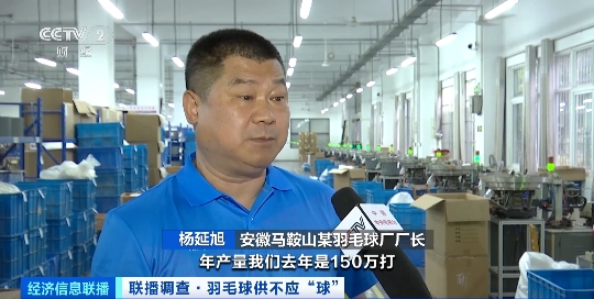 安徽马鞍山某羽毛球厂厂长 杨延旭:近几年来,我们产量不断增加,去年年产量达150万打,预计今年增长30%左右。