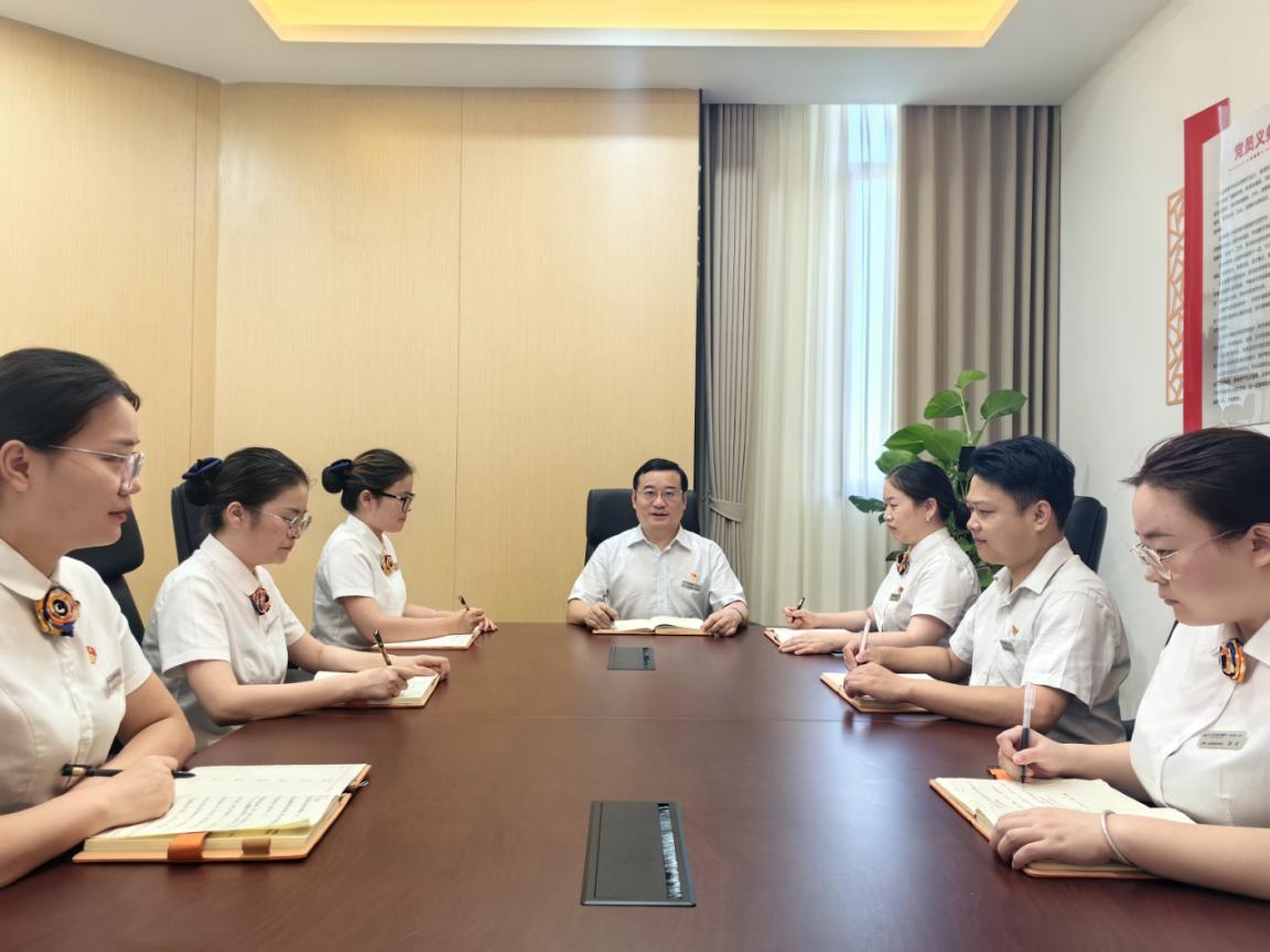 图注:石门沪农商村镇银行党支部书记、董事长陈明忠参加微小团队客户经理晨会的场景