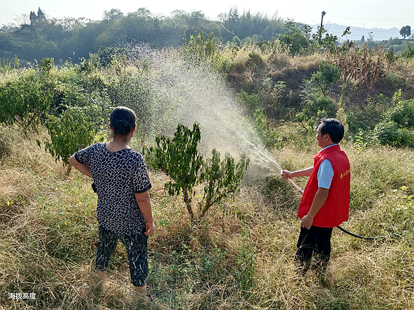 在太安村张某兵的花椒种植基地,杨世文看到工人浇水方式欠妥,夺过管子边浇水边讲解要领。他强调,连晴高温水源紧张,要把有限水量用在关键处。先向花椒树冠浇水确保叶片快速吸水转绿,再向树四周根系最发达处浇水,确保树最大限度吸收水量,一次浇水要足量以保证7天左右不用再浇,同时注意不要浪费水量降低成本。