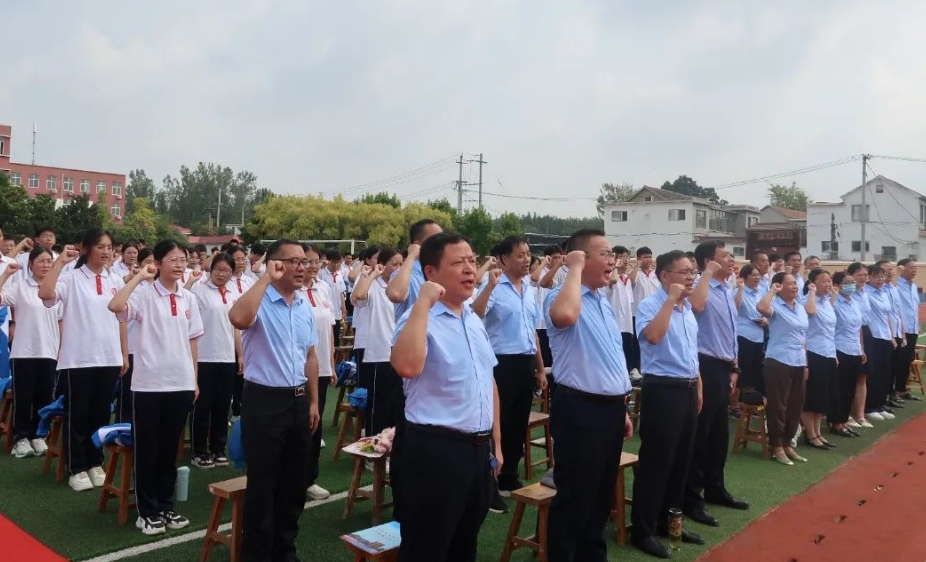 教师代表张成云老师朗诵寄语,表达殷切期盼,激励学生努力成长为担当民族复兴大任的时代新人;团委书记刘建慧老师带领全体师生共同宣誓,一起激发奋进未来的动力,更好展现责任担当,树立家国情怀。