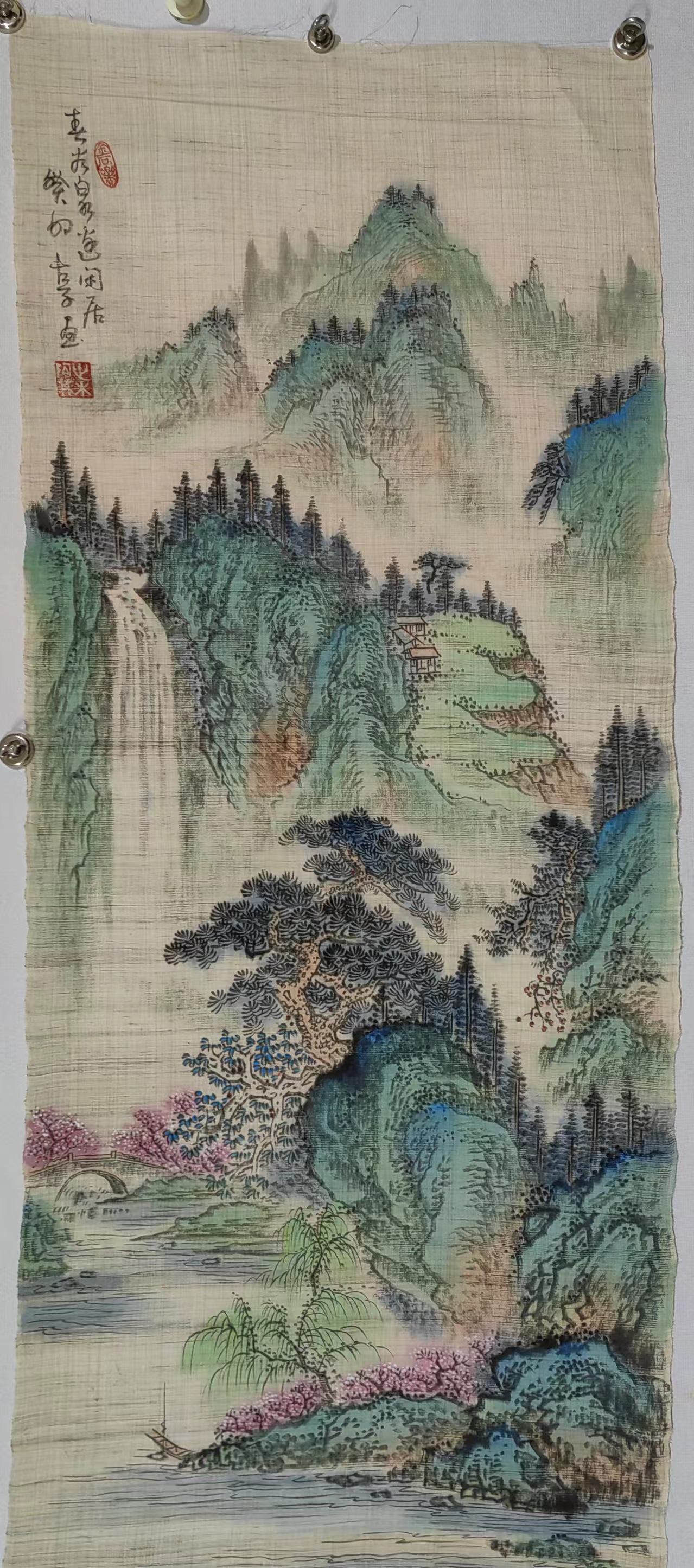 麻布具有良好的吸水性和透气性,能够形成自然渐变和过渡,以便颜料能够在画面上自由地流动和混合,具有环保、防腐、防虫蛀、以及防蚊效果,从而能够长期保存;麻布厚度适中,能够保证足够的坚韧度和强度,又能保证足够的柔软度和延展性,不易留下折叠痕迹和变形,适合绘制大型作品,比如长度可以无限加长,可以绘制极具收藏价值的长轴画卷;麻布带有自然纹格,特殊的纹理结构使得画面形成自然的线条,呈现出更立体的分层结构,麻布与矿物质染料相结合,不仅易于上色,颜色也经久不褪,画的品质可以长期长久保持,并且麻布含有天然香草成分,在保存和展示过程中能够缓慢释放丝丝香气,给观赏者带来嗅觉上的吸引等效果。