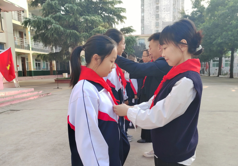南校区德育副校长曹营山宣读组建七年级少先队的决定,宣布大队辅导员、大队长,中队辅导员、中队长及队员名单。少先队大队长带领大家重温入队誓词,重温这一庄严时刻,将责任铭记在心。