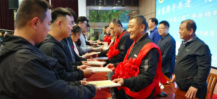 东方中学教育集团教导处副主任王冬青宣读青蓝工程师傅徒弟结对教师名单,同时宣读青年教师基本功比赛方案。东方中学教育集团领导颁发聘书。青年教师徒弟为师傅佩戴红花,师傅为徒弟赠送书籍。