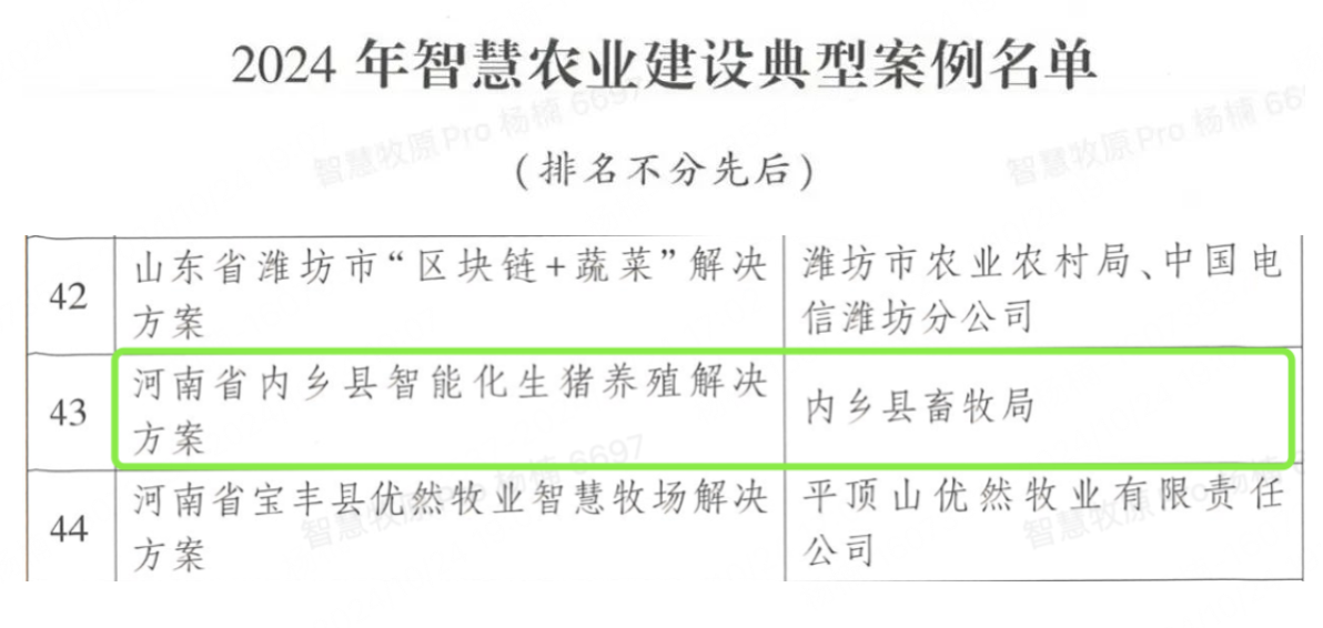 近日,农业农村部信息中心公布了“2024年智慧农业建设典型案例”,以内乡牧原肉食产业综合体建设项目为样本的《河南省内乡县智能化生猪养殖解决方案》被评定为全国85个典型案例之一,成为全国农业科技发展的一个典型代表。