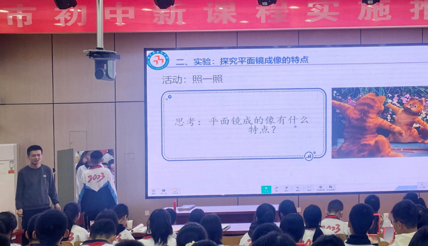 来自东方中学的于巧静老师讲授了九年级第十四章第五节《测量电压》。她以通俗的导入,通过将水流类比成电流,引导学生思考电流产生的原因。接着通过电压表的实物展示,向同学们讲解电压表结构,引导同学们进行电压表读数。来自济宁市第七中学的王海威老师讲授了八年级第三单元第二节《探究平面镜成像特点》。上课伊始,王老师通过演示实验,导入新课,引发学生认知冲突,激发学生的学习好奇心。随后,学生在实验探究过程中观察并猜想平面镜成像的特点。学生根据猜想设计探究方案,分组进行实验,收集证据、分析数据得出实验结论。学生在实验探究中不仅加深了对平面镜成像的理解,而且培养了实践探究能力。以小组汇报的形式展示实验探究的成果,学生的综合能力得到提升。最后,学生在王老师的引导下总结归纳所学知识。