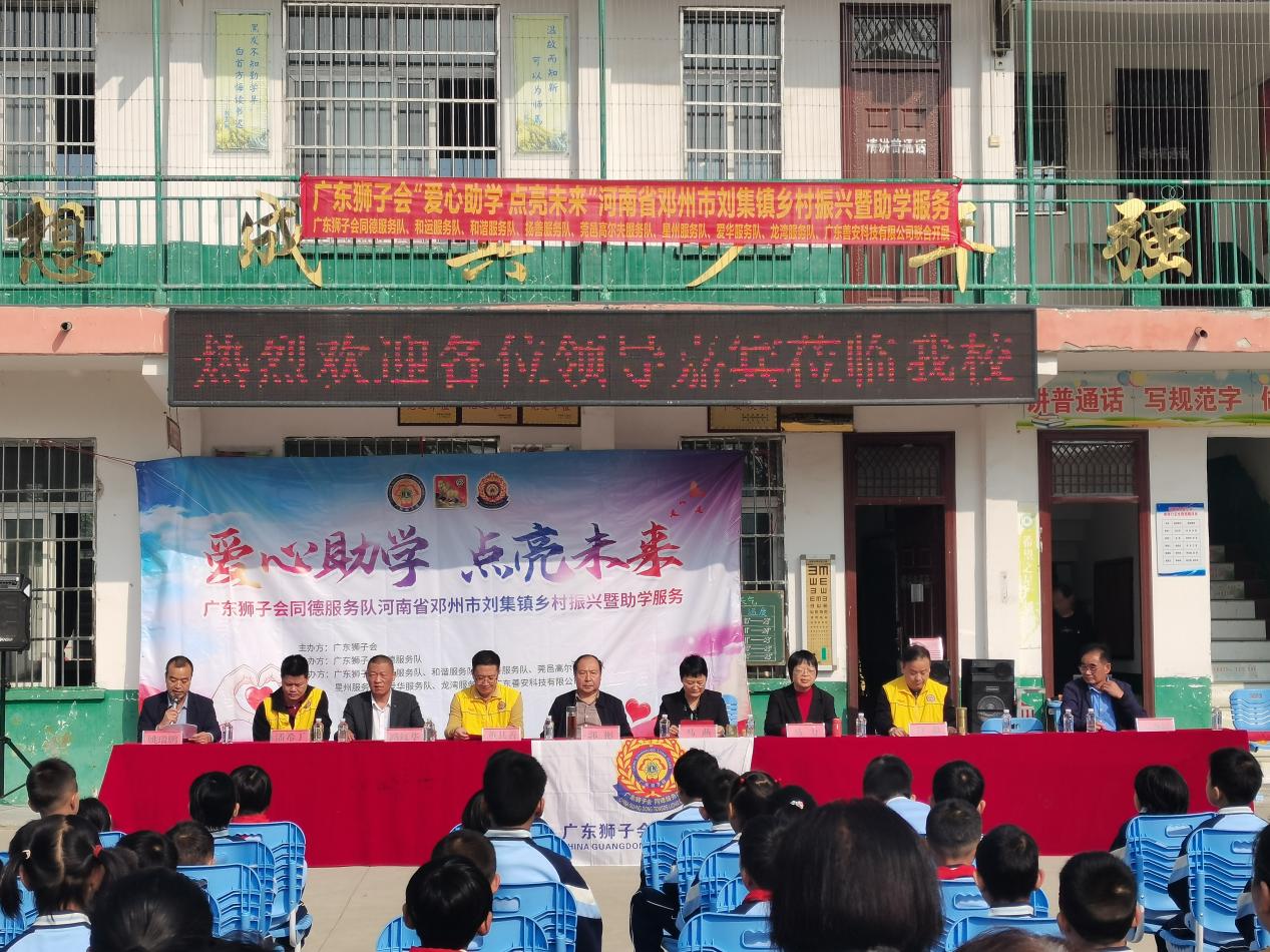 10月29日,河南省邓州市工商联携手广东狮子会同德服务队在刘集镇余家村举行“万企兴万村”暨助学捐赠活动。刘集镇党委书记马燕同志、市工商联副主席马力、二级主任科员郭彬,广东狮子会同德服务队队长肖毅、副队长潘希丁、秘书长吴海波、邓州乡贤董其善、骆子进等人参加捐赠活动。