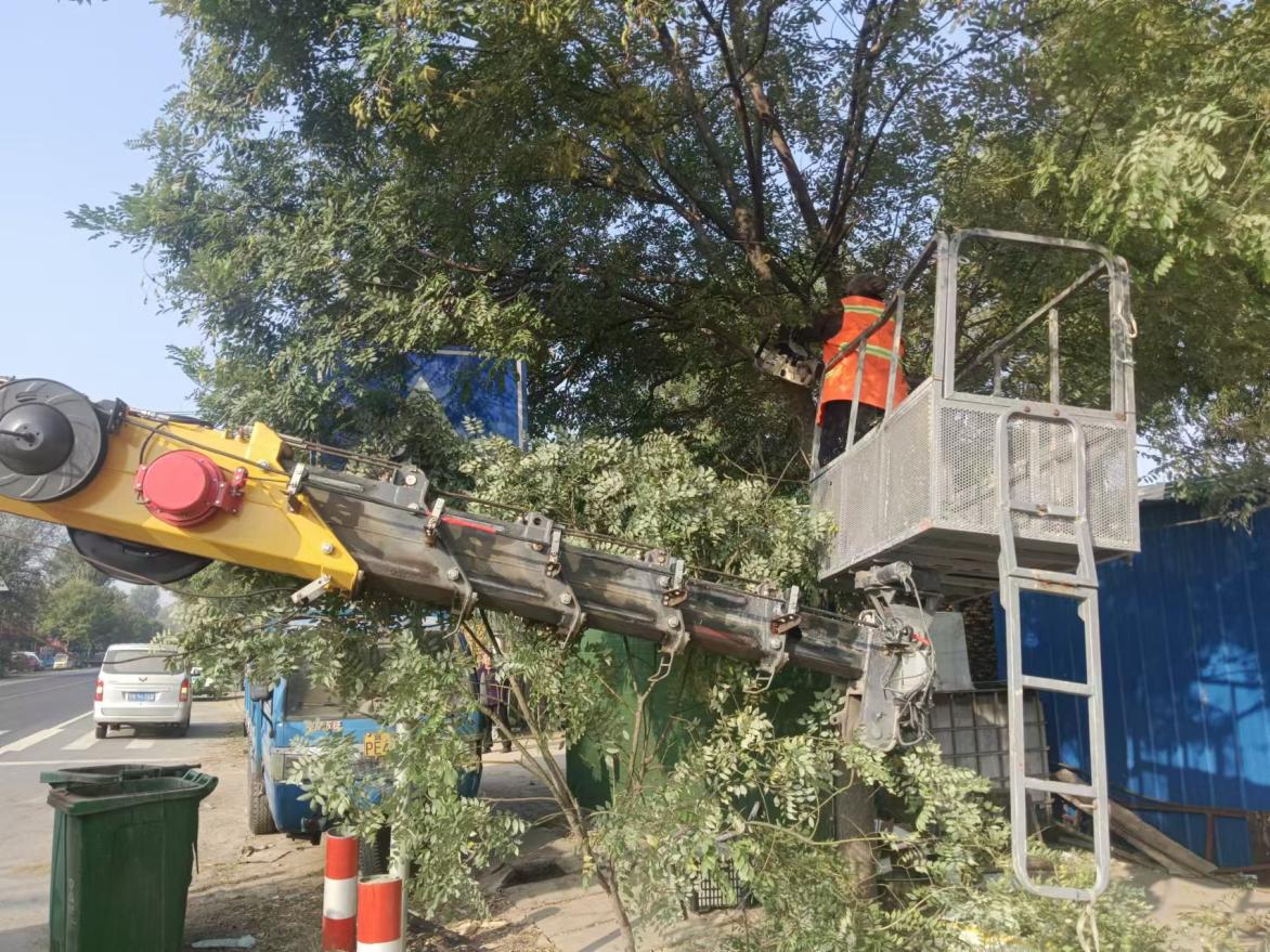 养护人员做好现场指导,严格按规范作业,根据遮挡情况确定修剪标准和尺度,采取“升降机+人工”登高修剪方式,遵照高空作业安全提示展开修剪工作,并及时收拢、清运地面枝叶,防止施工残渣造成安全隐患。