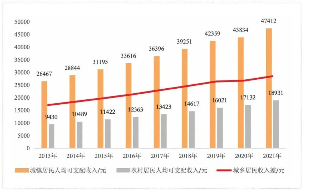 以要素双向流动为抓手加快推动县域城乡融合不仅有助于乡村振兴战略与县域新型城镇化的协同并进,也是实现城乡共同富裕的根本要求。当前,我国共同富裕的薄弱的环节是县域城乡经济发展的不充分与不平衡问题。以城乡人均可支配收入为例,县域城乡人均可支配收入差值从2013年17037元扩大到2021年28481元,其内在的绝对差值又同样呈现出不断扩大的趋势(见图1)。