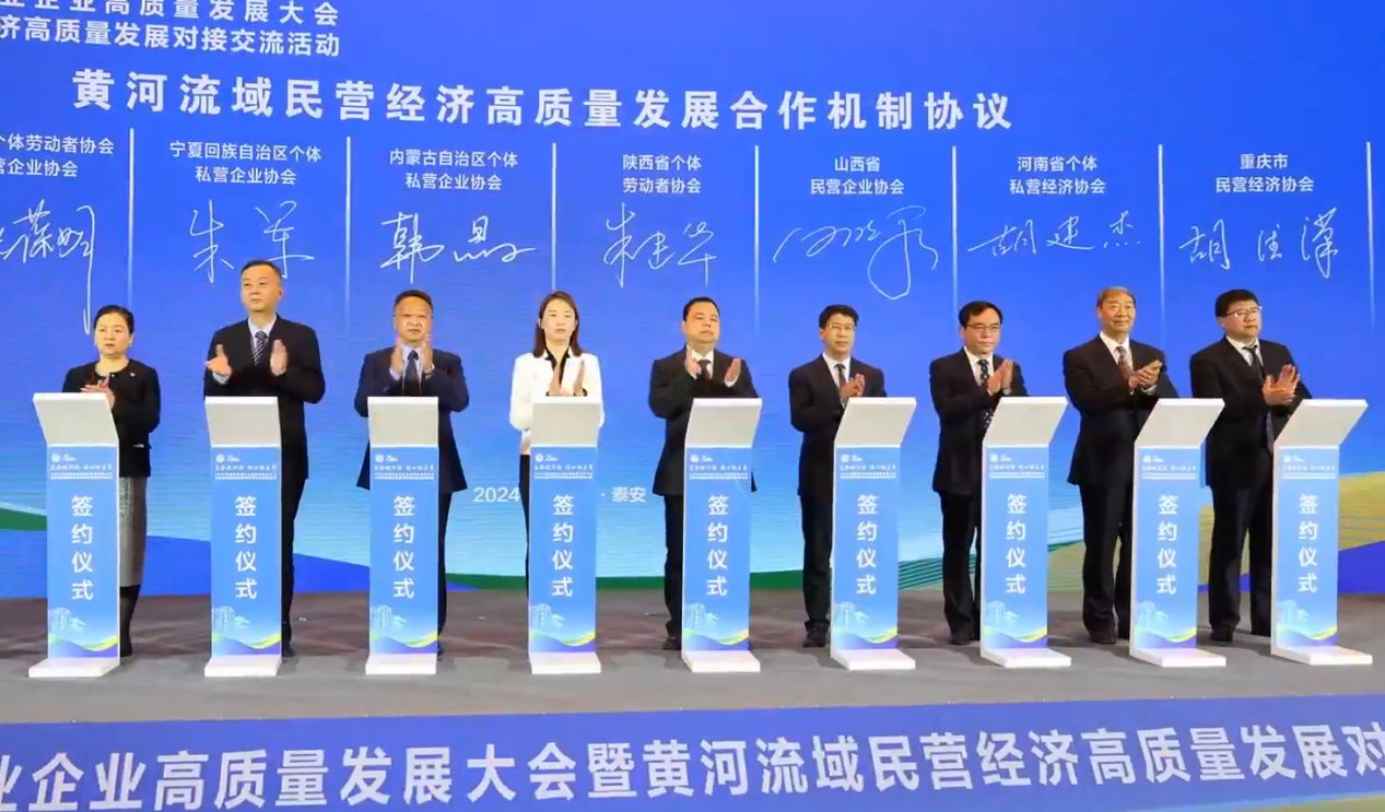 会上,沿黄9省区和重庆市个私协会共同签订了黄河流域民营经济高质量发展服务合作机制协议,并与阿里巴巴国际站、跨境供需匹配平台分别签署“民营经济拓展海外市场”服务行动合作备忘录和产业展贸对接战略合作框架协议。启动了“民营企业拓展海外市场服务行动”,邀请有关企业运营专家进行宣讲推介。活动还安排了高端装备企业协同发展对接交流,泰安市5家企业代表作了重点推介,部分外地参会企业作了交流发言。