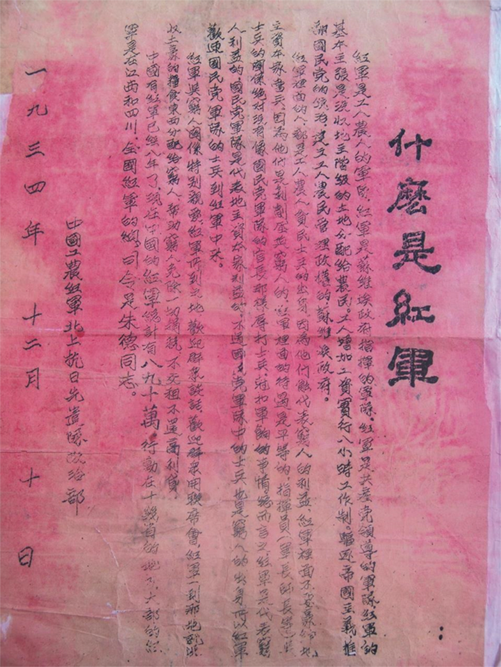 在这里,红二十五军着手宣传党和红军的政策,播撒革命火种,《什么是红军》宣传单就是在当时印发的。传单内容由红二十五军政治委员吴焕先、副军长徐海东和政治部主任郑位三商议起草,由时任红二十五军军部秘书兼宣传科长刘华清刻印。传单共15行400多字,言简意赅地宣传了中国工农红军的性质、主张、组成、任务和有关政策。湖北口回族乡虎头岩村青年李玉才,就是那时加入的红军队伍。1935年,红军主力北上后,郧西县湖北口回族乡农妇刘立英将丈夫李玉才(当时为红军特务队副班长)留下的《什么是红军》传单包了又包、藏了又藏,舍命守护了46年。直到1981年,刘立英将其上交给组织,这张珍贵的传单才得以公之于世。这张传单是全国唯一现存的原件,现存于郧西县档案馆,是档案馆的镇馆之宝。