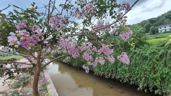 早些年,家乡为了建设好泉湖农耕休闲园,美化靓化大泉干河风光带。沿着河道栽上桂花树和紫薇,一株挨着一株互相搭配,普通的紫薇花,经过精心培育管理,从此脱胎换骨登上了大雅之堂。“盛夏绿遮眼,此花红满堂。”紫薇开花时间要比桂花先早两个月,盛夏时节,紫薇盛放,为炎炎夏日增添了一抹浪漫气息。紫薇花夏秋之季装扮着大泉干河,花朵姹紫姻红更是连片如云,绚烂如霞成了一道亮丽的风景线。