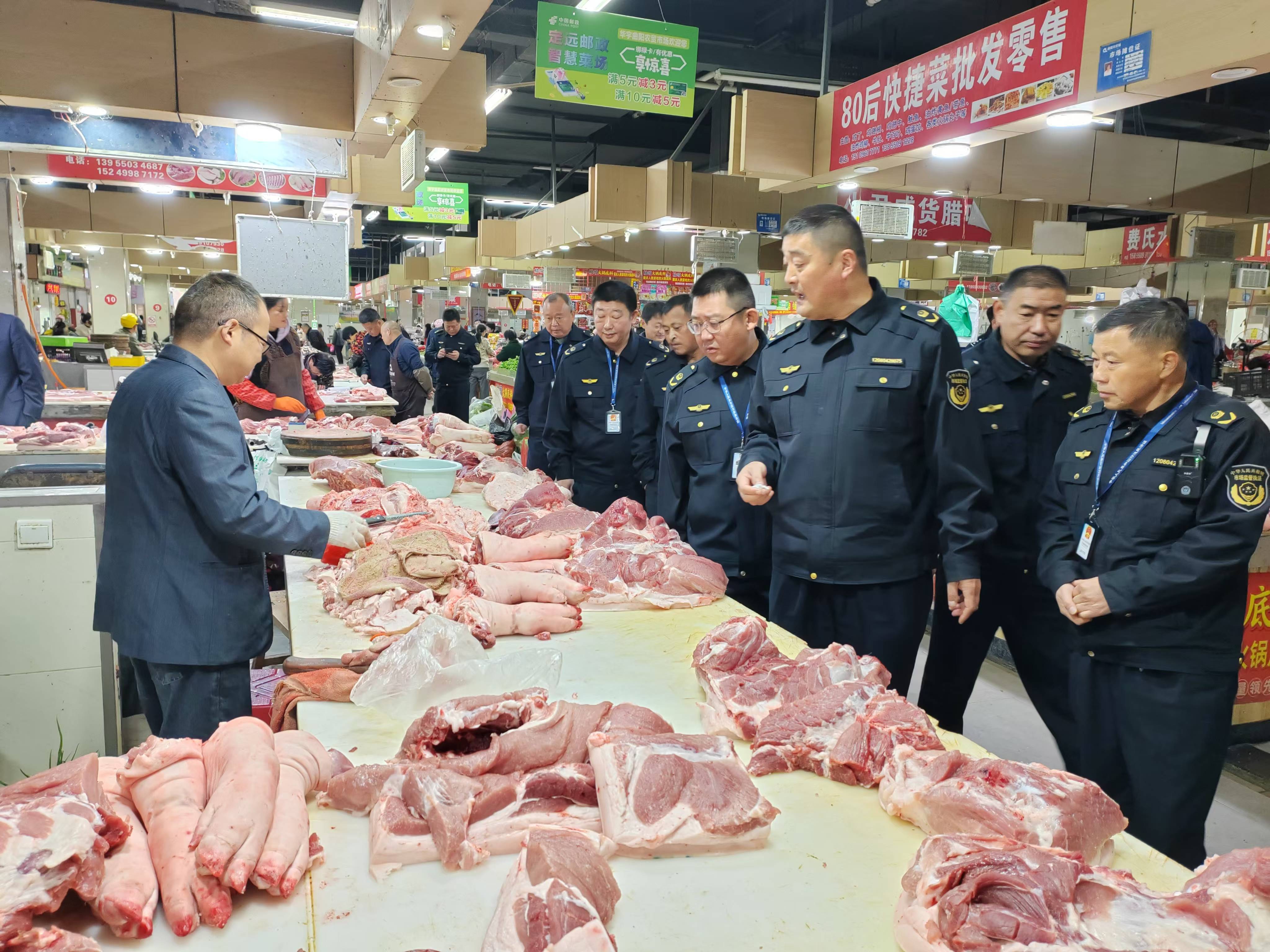 图为执法人员检查农贸市场猪肉经营行为