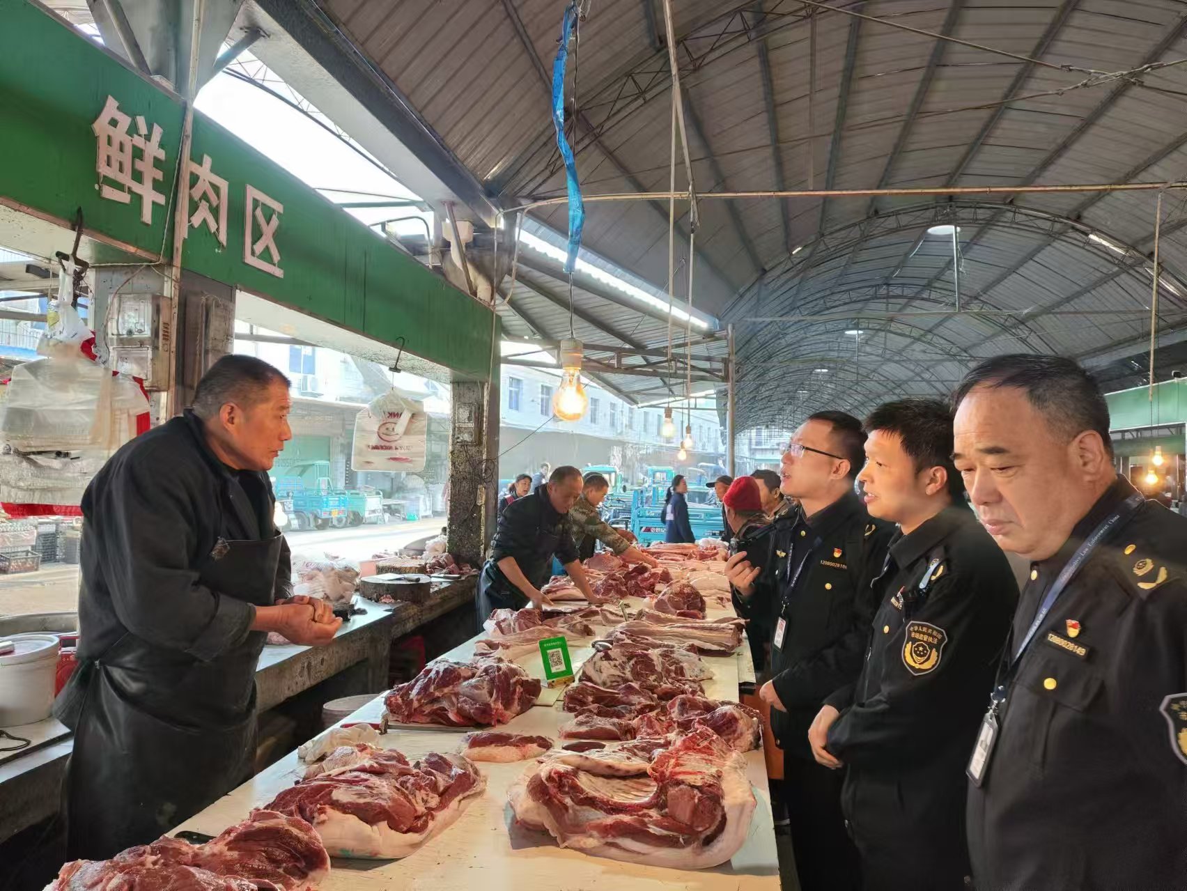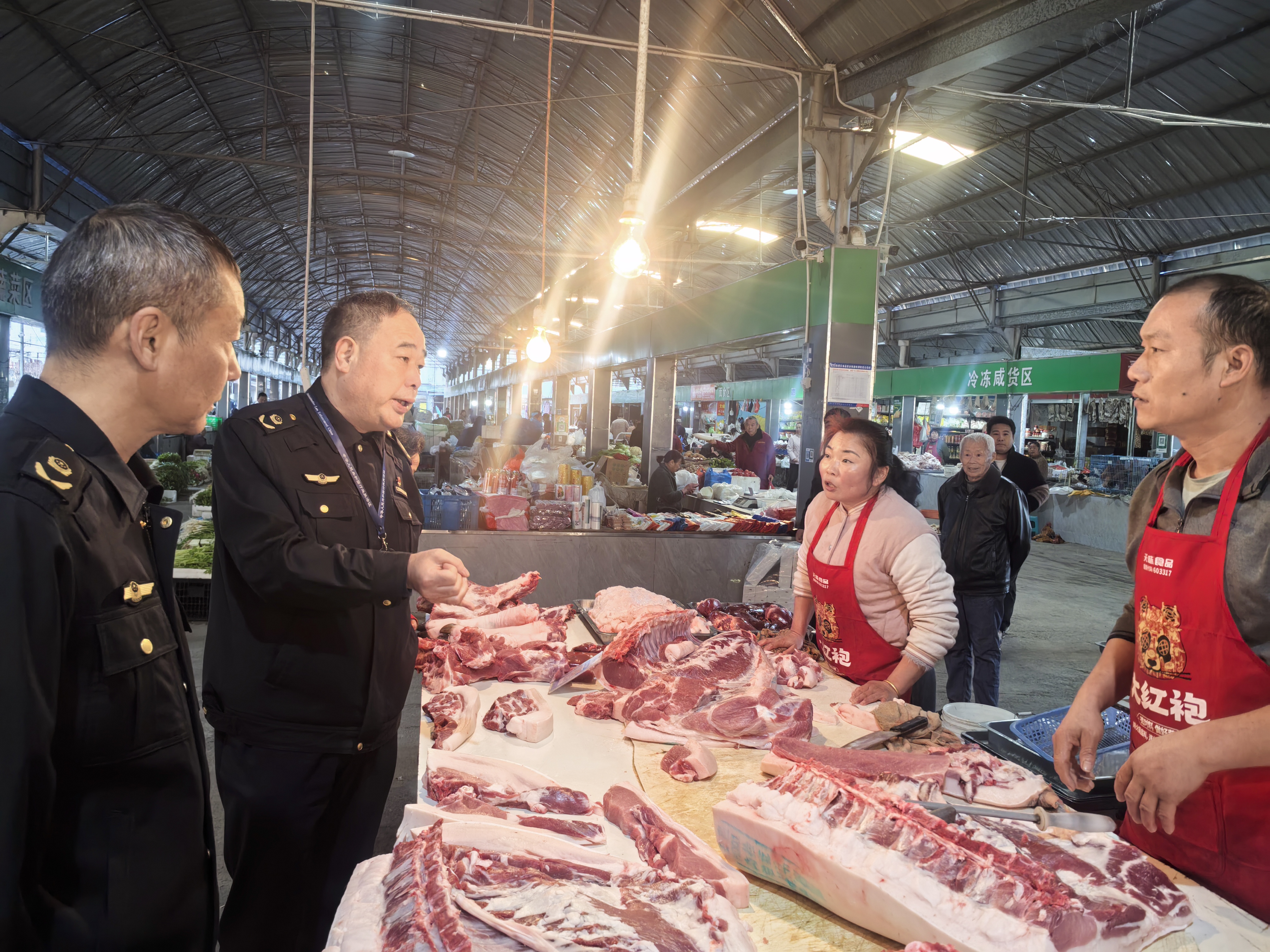 图为执法人员检查猪肉市场经营行为