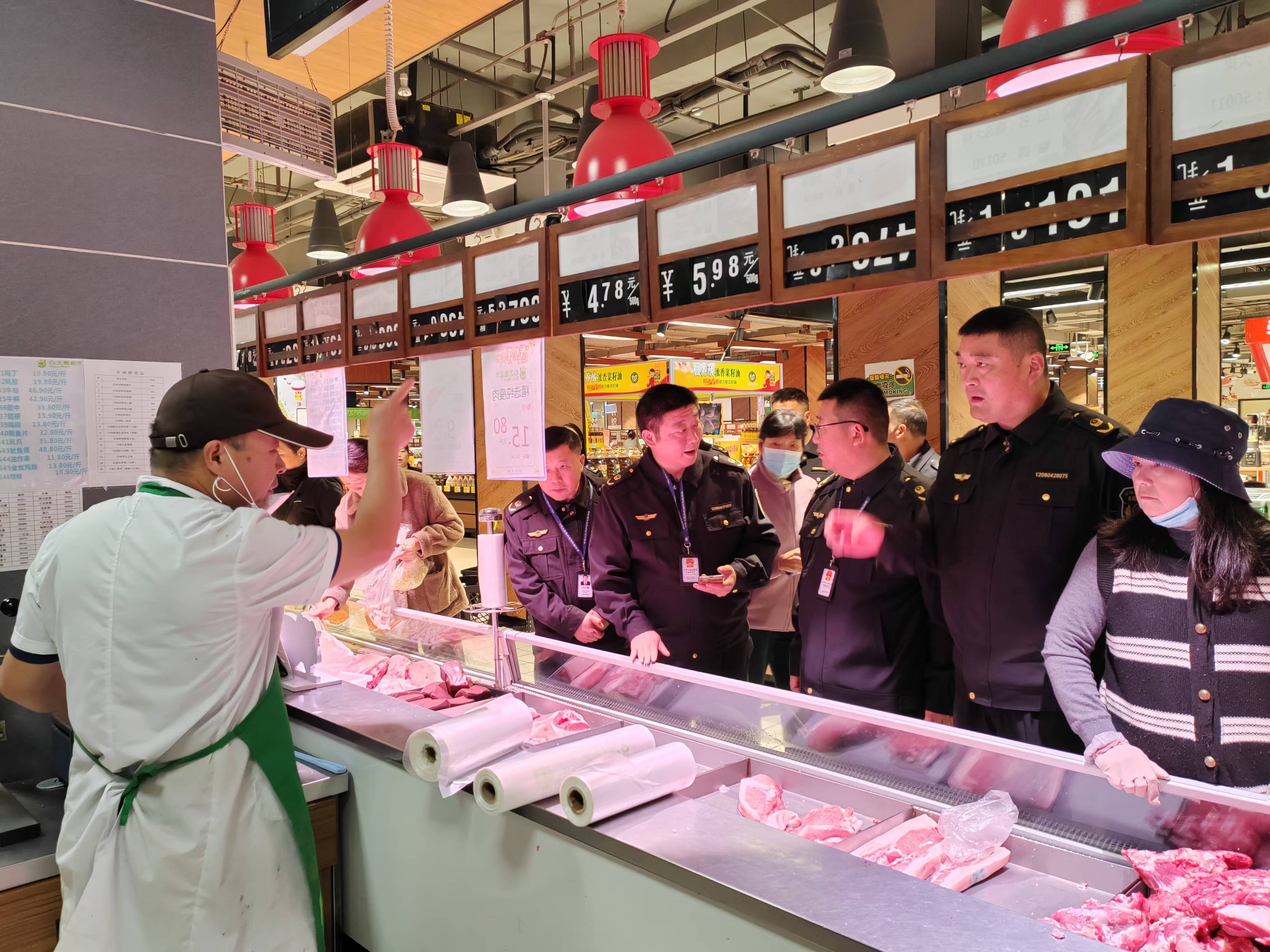 图为执法人员检查商超肉类产品市场销售情况