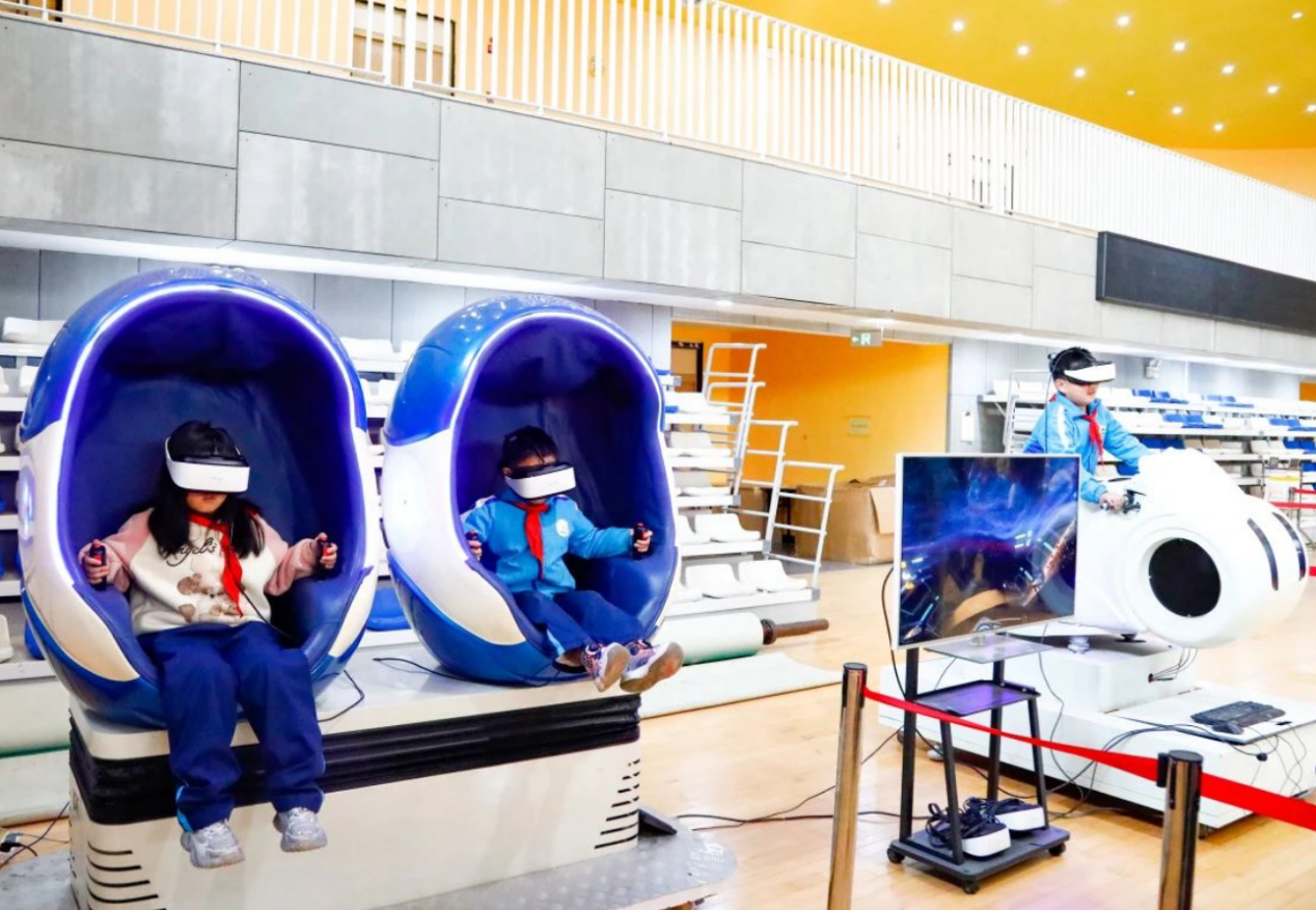 科技体验项目主场地设在体育馆,除保留了科技大篷车、非遗展示等往届的热门项目外,还新增了同学们非常感兴趣的互动科技体验项目,包括VR飞船、VR赛车、AR画图等。