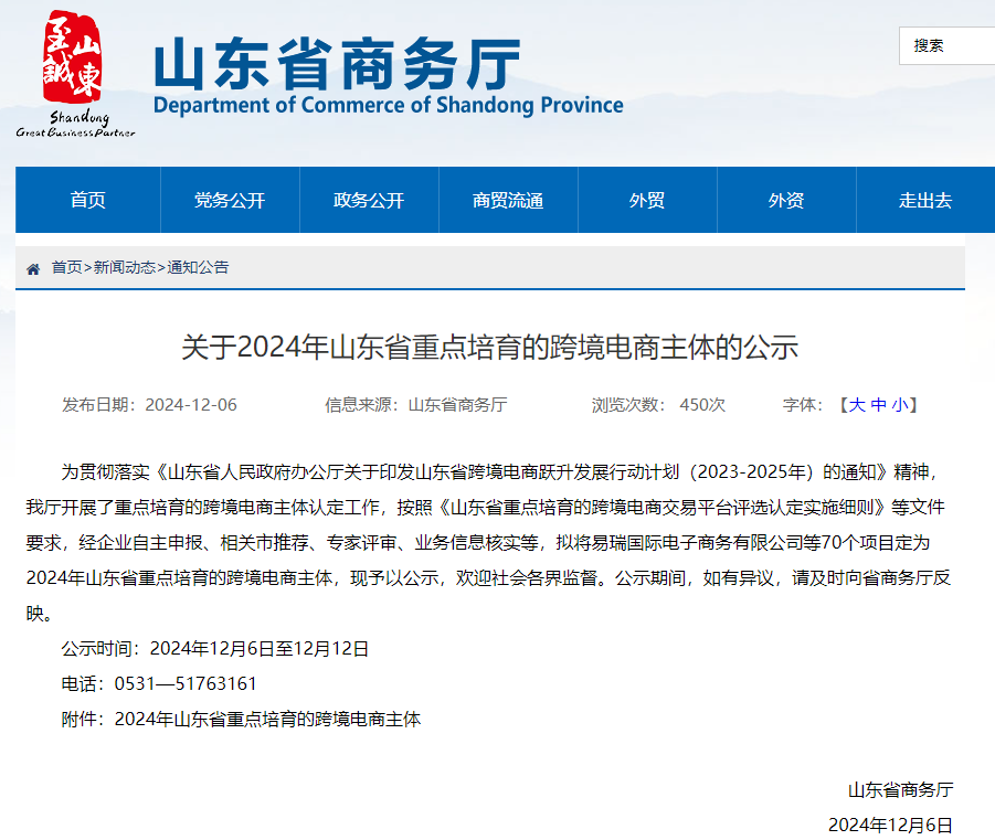 近日,山东省商务厅发布“关于2024年山东省重点培育的跨境电商主体”公示,全省70个项目定为2024年山东省重点培育的跨境电商主体,其中,48家企业被列为跨境电商品牌企业公示范围。