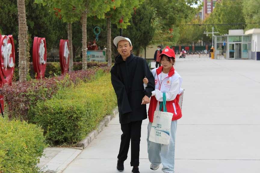 图为十二团医院志愿者搀扶来院就医的残疾患者就医。