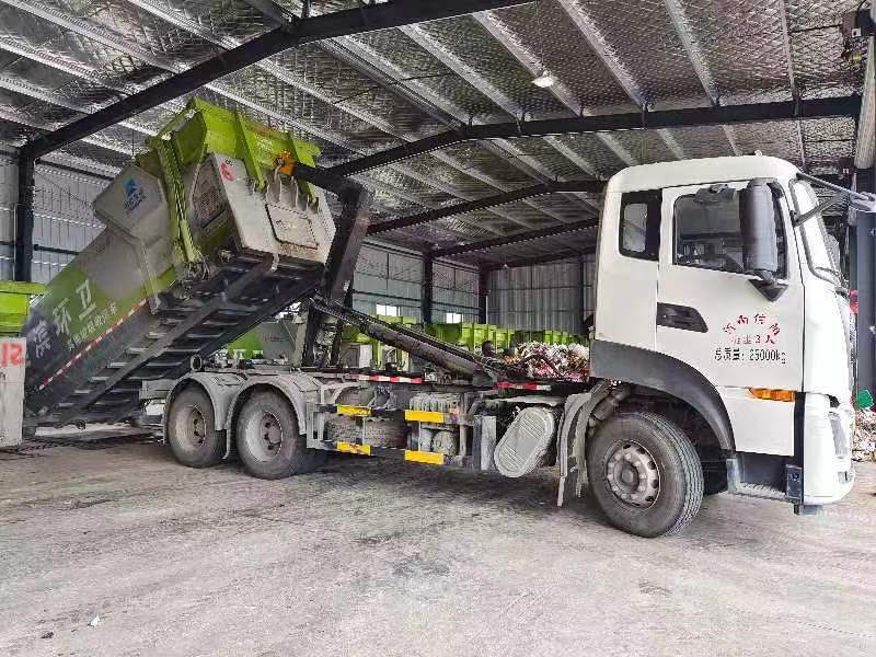 上图信阳市淮滨县采购的12套“东方红”可卸式移动压缩垃圾中转站投入运行。