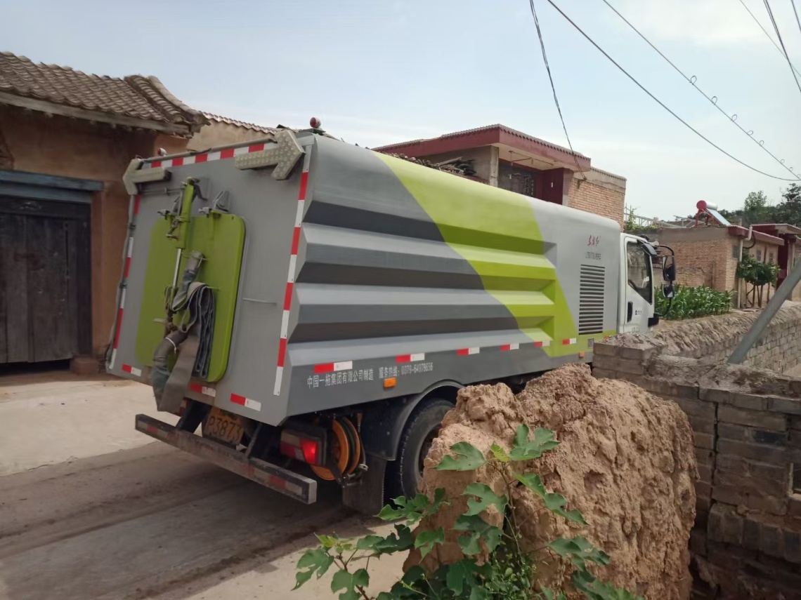 上图“东方红”8吨洗扫车在山西省运城市平陆县进行村庄道路清扫作业。