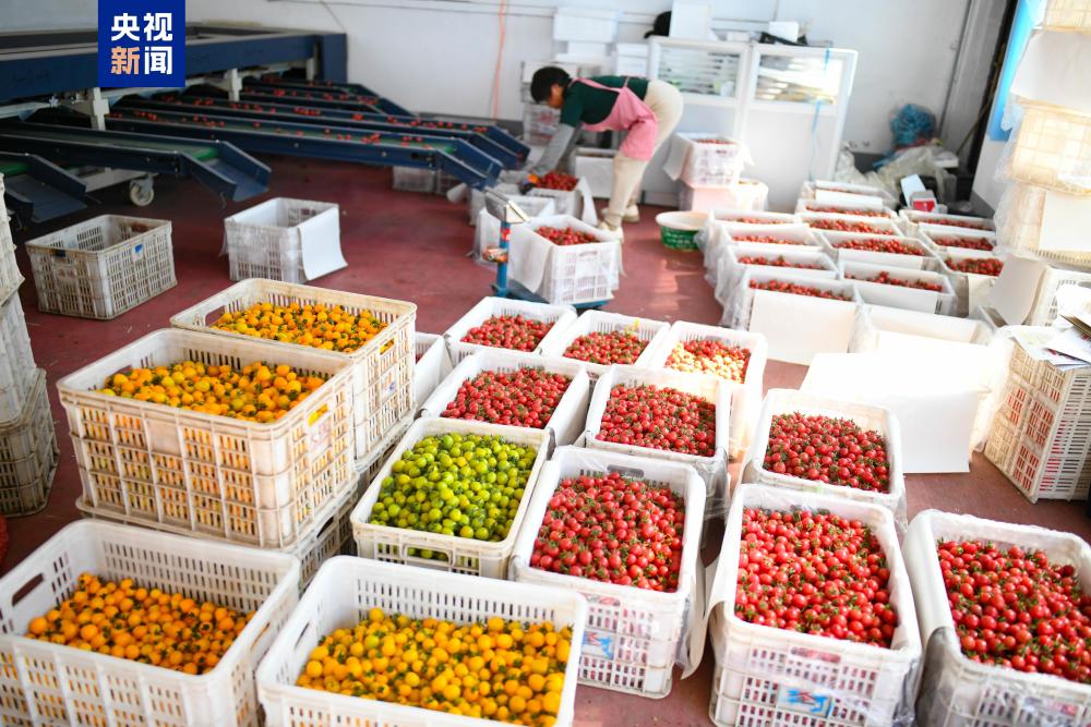 △在位于山东潍坊寿光市古城街道前疃村的寿光市旺民蔬菜专业合作社联社内,工作人员正在分拣“七彩小番茄”