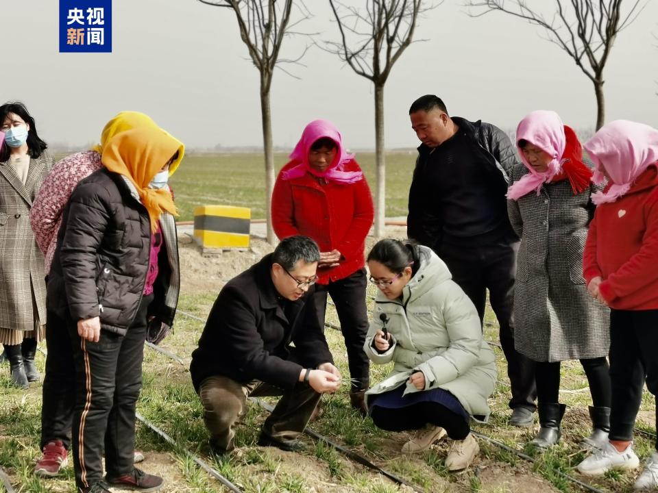 △返乡创办家庭农场的高密市大学生刘莉(右四)与农业专家一同向农民传授种植新技术