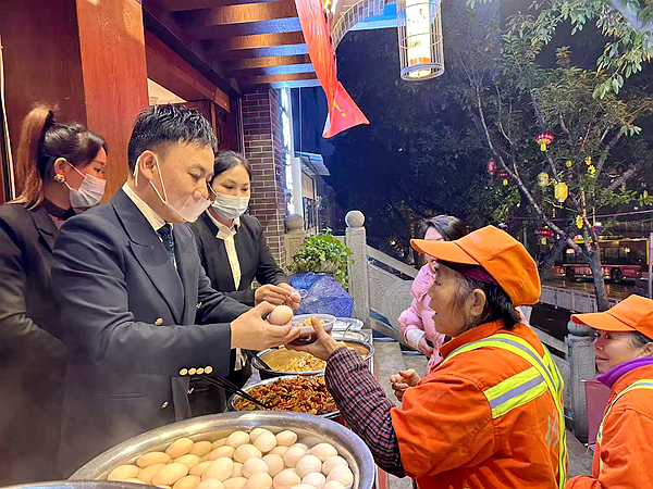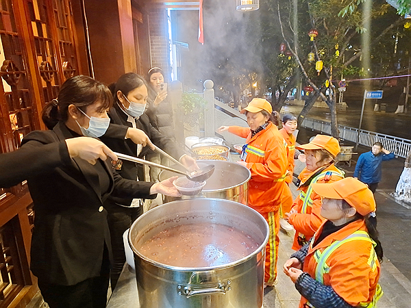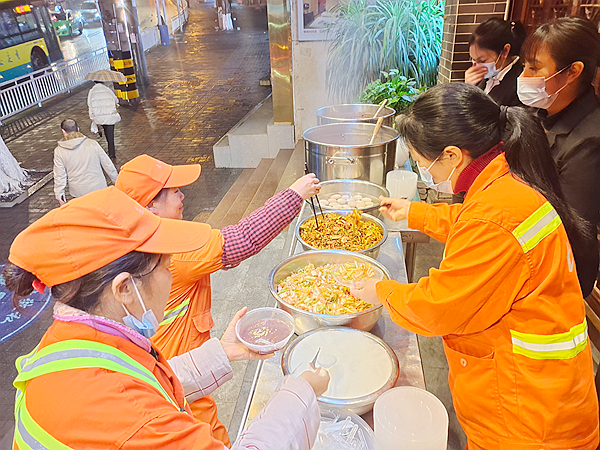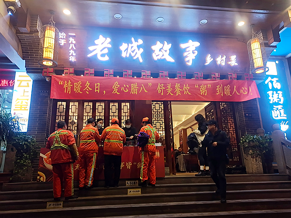 1月7日腊八节清晨,重庆市舒美餐饮有限公司旗下“老城故事·乡村菜”门店前热闹非凡,一幅“情暖冬日,爱心腊八”的横幅格外醒目,下方“无惧风雨,万事皆‘粥’全”的祝福语传递着浓浓温情。当天,舒美餐饮为涪陵高笋塘附近的环卫工人、出租车驾驶员、老人、医护工作者、务工人员等群体,送上了热气腾腾的腊八粥。