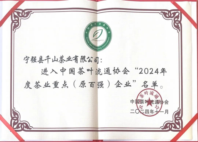 宁强县千山茶业有限公司被评为“2024年度茶业重点(原百强)企业”。
