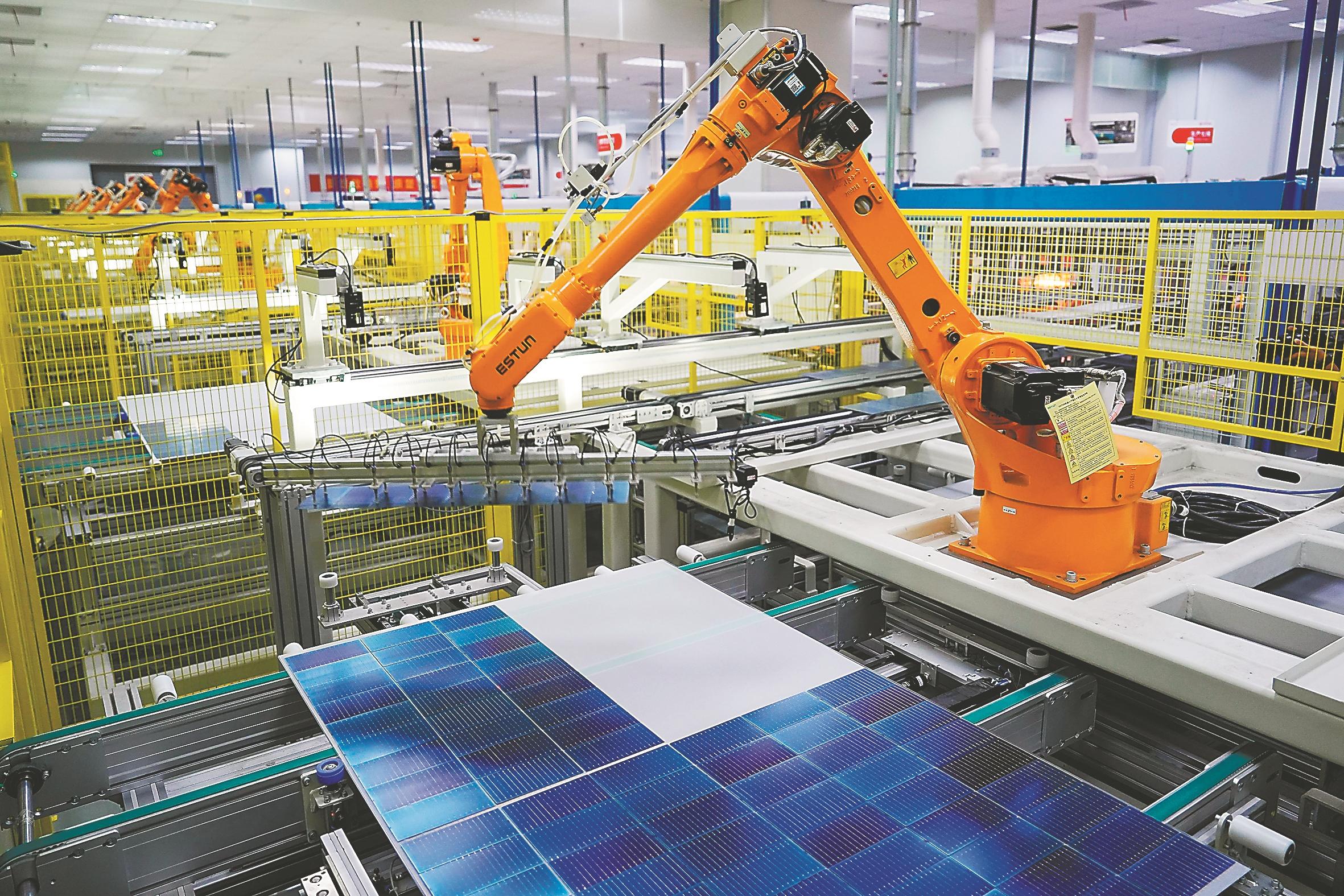 “公司生产的双玻高效光伏组件,相比于以前的单面玻璃,实现了两面发电,发电效率提升了近20%。”安徽赛拉弗能源有限公司副总经理毛锐介绍,该公司能造出好产品,除了自身技术领先,还得益于周边有“好配套”。企业不远处就是行业领先的光伏压延玻璃生产企业,由它们生产的超白光伏压延玻璃,太阳能透光率达到了94%,大大提高了赛拉弗电池板的光能利用率。