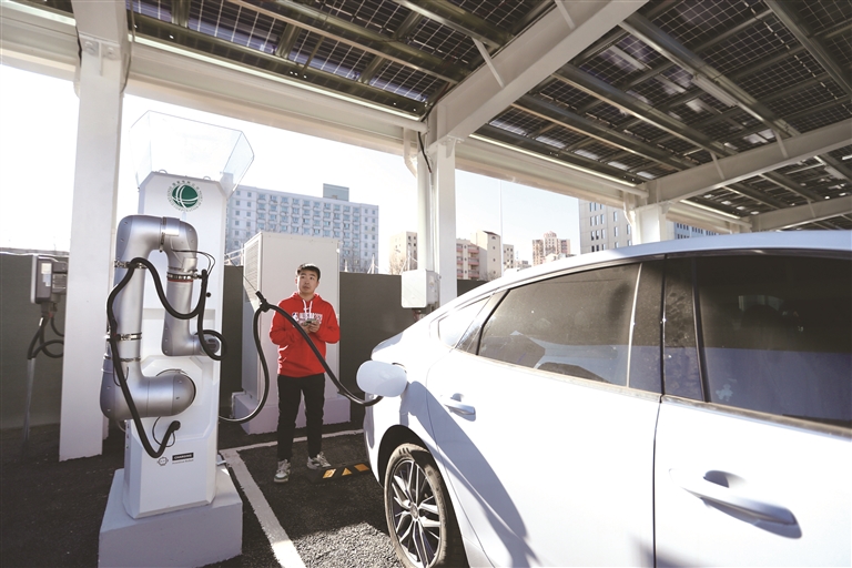 2024年12月26日,北京姜庄湖智慧绿色超充港,车主体验全自动智能充电机器人。该站是国网北京市电力公司在北京建成的首座集光伏、超充、V2G、无线充、智能机器人充电等多项先进技术于一体的智慧绿色充换电站,日均充电服务能力达到3000车次,超级充电服务能力居全市首位。日前,该站已正式建成投运。(王紫儒 摄)