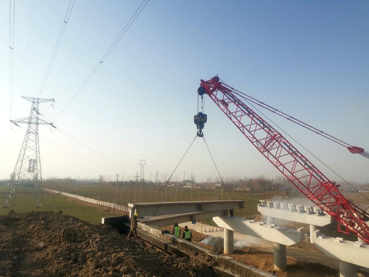 1月16日,在济宁兖州区220千伏安都线下,济微高速北延工程(JWSG-4标段)施工现场,桥梁板架设工序大型施工机械往来穿梭,一片繁忙景象。