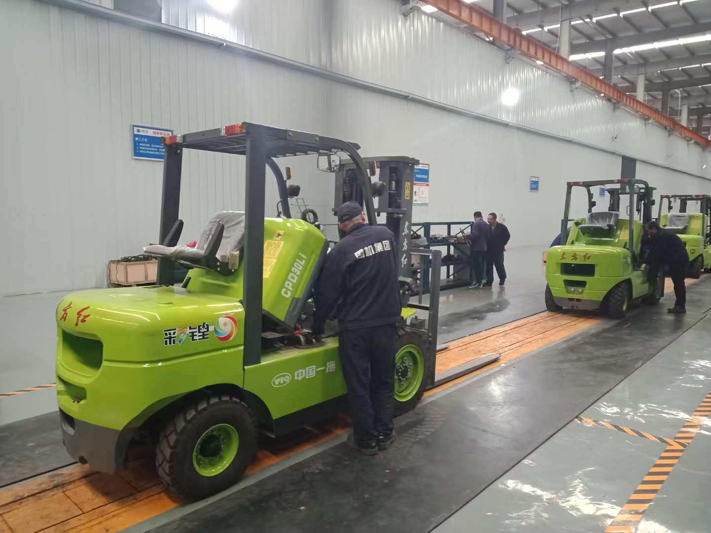 “东方红”锂电叉车正在生产线上装配