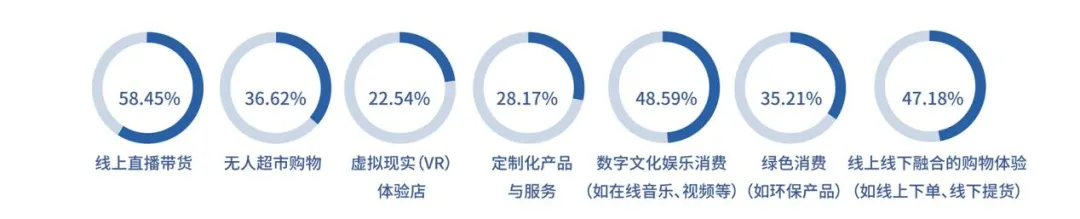 【观察二】参与的新型消费模式:线上直播带货是最受欢迎的新型消费模式,其次是数字文化娱乐消费和线上线下融合的购物体验。