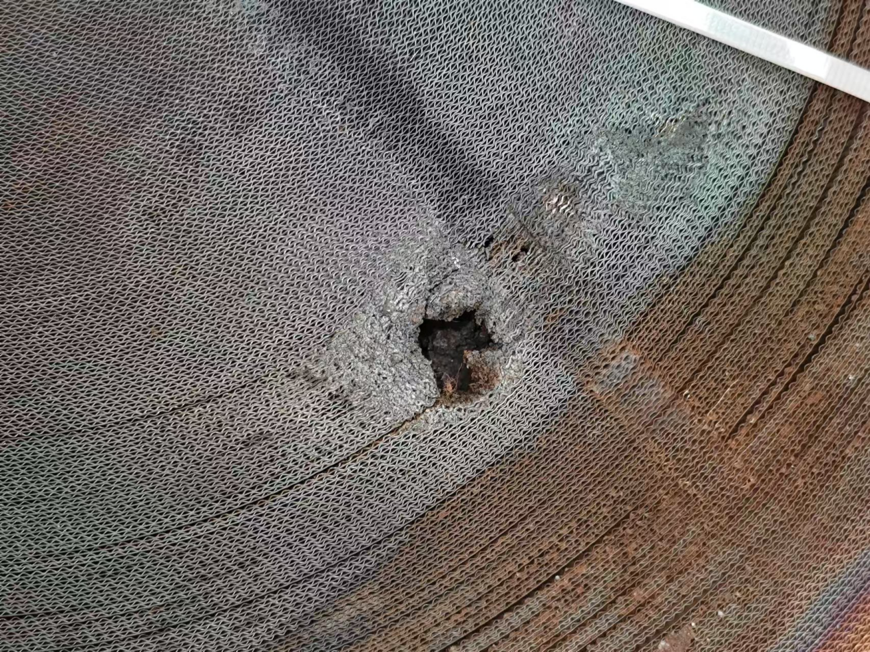 近日,某石化企业一裂解炉突发回火,火焰在管道中回窜到阻火器,不仅以燃烧方式炙烤着阻火器,而且还屡次变身为非稳态爆轰对阻火器进行攻击。一般的阻火器,恐怕早就投降了,可这次火焰遇到了普瑞泰格的爆轰阻火器。尽管阻火器的壳体因为高温炙烤而变色(图1),压环因为非稳态冲击波而变形(图2),部分阻火盘变形,甚至被高温火焰烧熔(图3),但是火焰硬是被挡在管道中,避免了一场安全事故的发生!