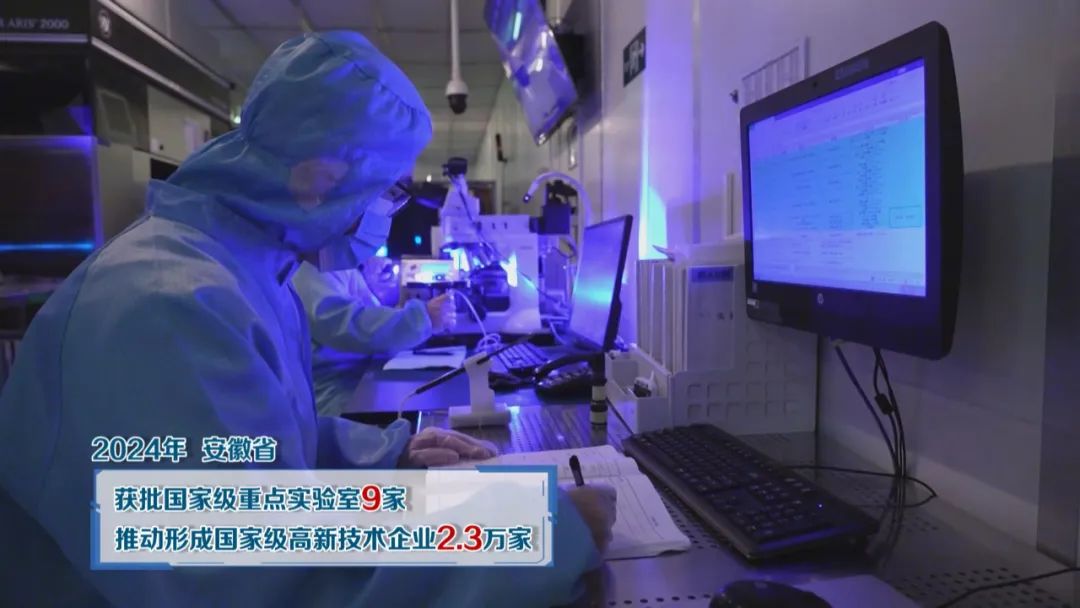 眼下一批高能级科创平台正在江淮大地加速涌现,2024年,安徽支持科技领军企业牵头、联合产业链上下游企业和高校、科研院所组建了21家省级产业创新研究院,累计拥有省重点实验室、工程研究中心等省级重点科研平台近3800家,获批国家级重点实验室9家,推动形成国家级高新技术企业2.3万家。
