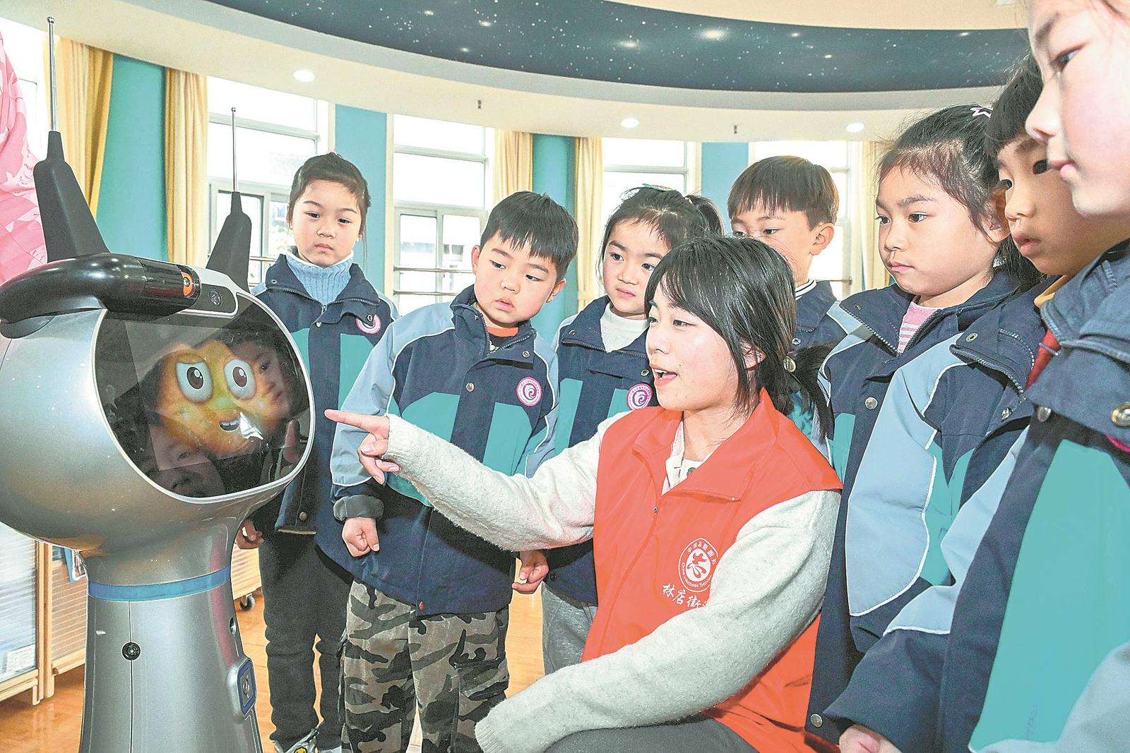2月27日,合肥市庐阳区林店街道荣城幼教集团丽水分园,小朋友们正在与机器人交流对话。今年以来,庐阳区教体局通过机器人进幼儿园的方式普及人工智能教育,激发孩子们对科技的兴趣。