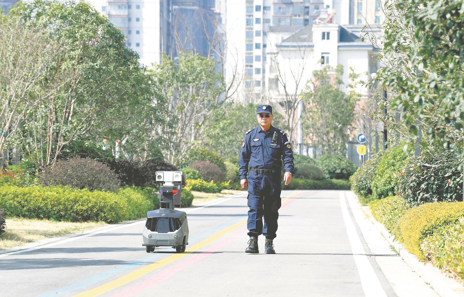 2月27日,六安市裕安区万兴·滨江府小区的一名保安在查看机器人“保安”的巡逻路线。机器人的巡逻监控、异常行为识别、自动报警等功能和夜间不间断巡逻,大幅提升了小区业主的安全感。
