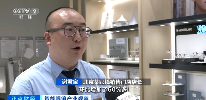 北京某眼镜销售门店店长谢君宝:我们在全国100多家门店,铺设了有智能眼镜的专柜,销量环比增长了60%多,以上班族、开车族、喜欢科技产品的消费群体为主。