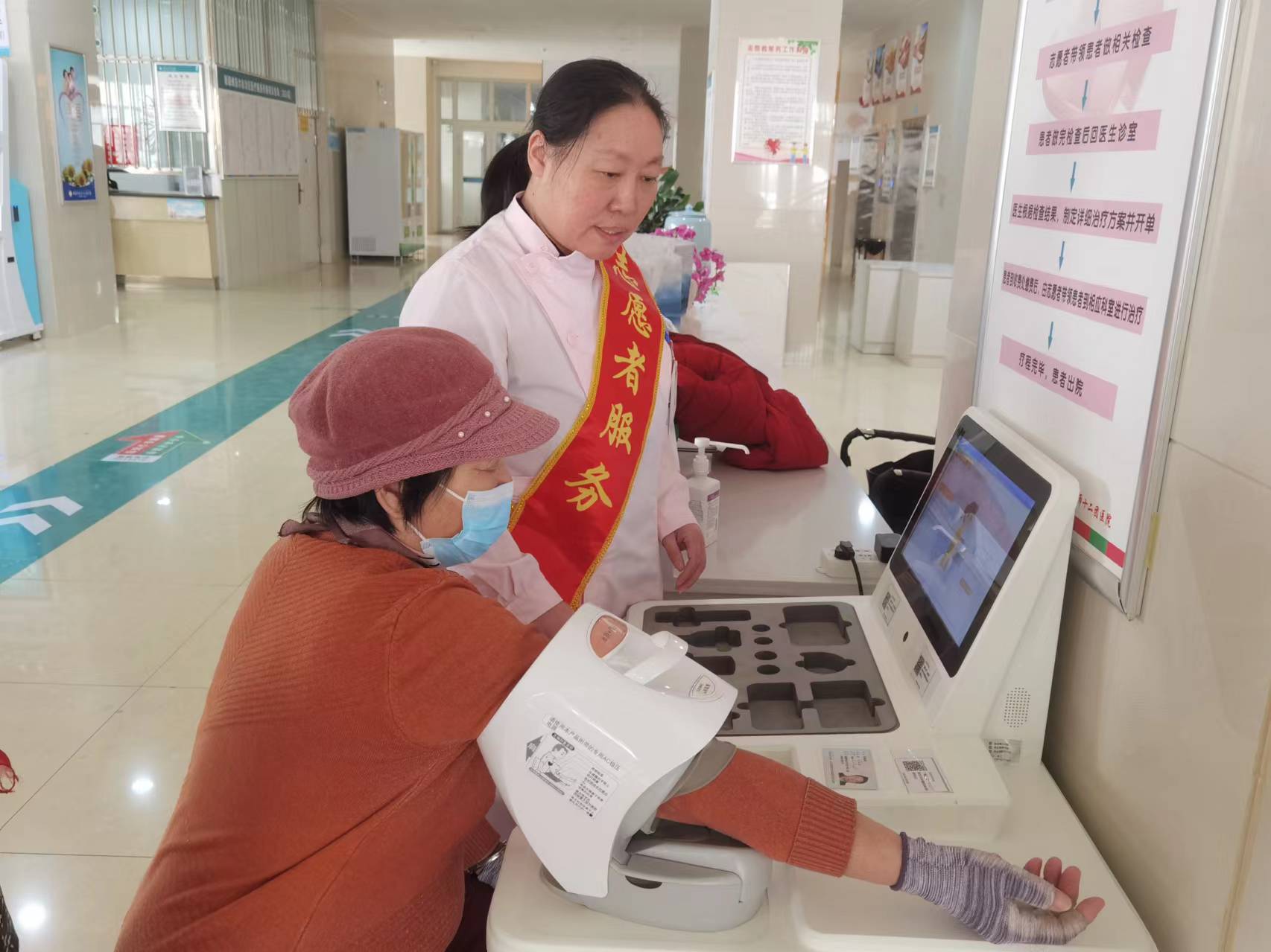 图为十二团医院志愿者为老人进行智慧健康服务。