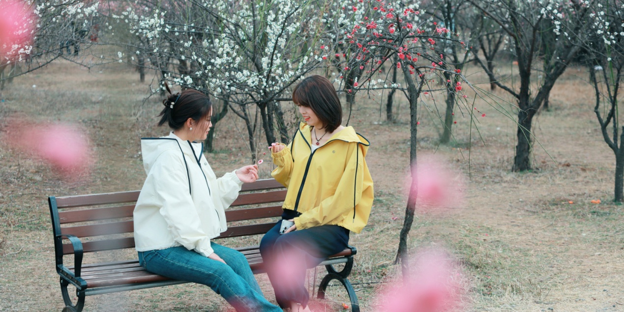 3月8日,两位市民在该市承留镇花石村梅园休息