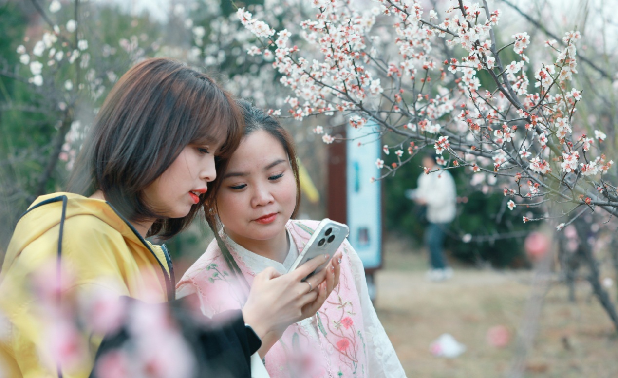 3月8日,两位市民在该市承留镇花石村梅园查看拍摄的梅花