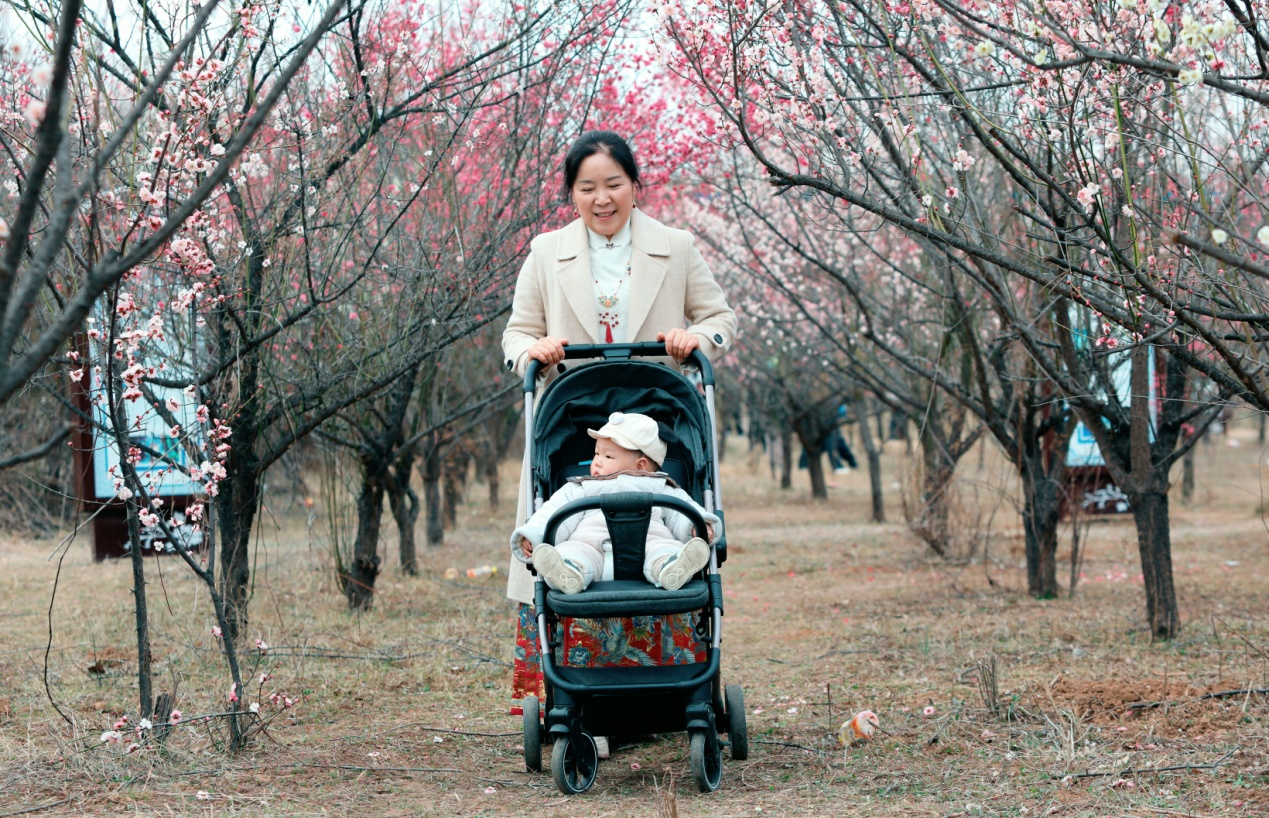 3月8日,一位带着孩子的市民在该市承留镇花石村梅园游玩