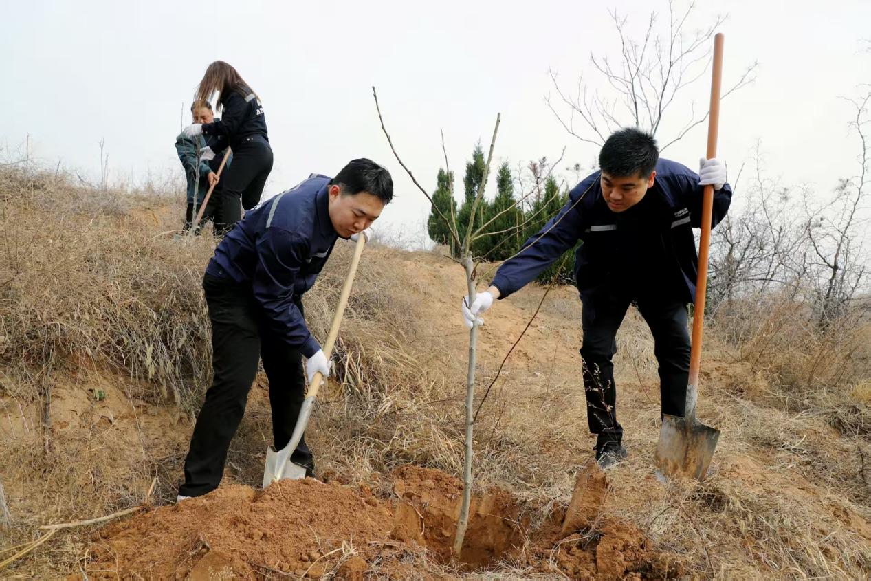 3月11日,中移铁通有限公司济源分公司员工在河南省济源市坡头镇栗树沟铁通公益林开展植树活动。