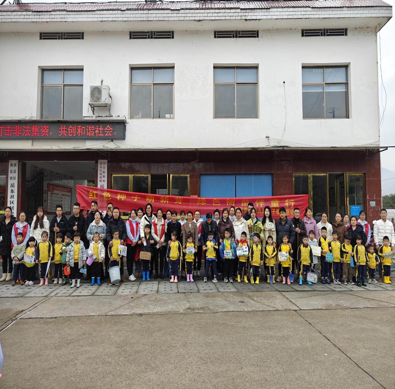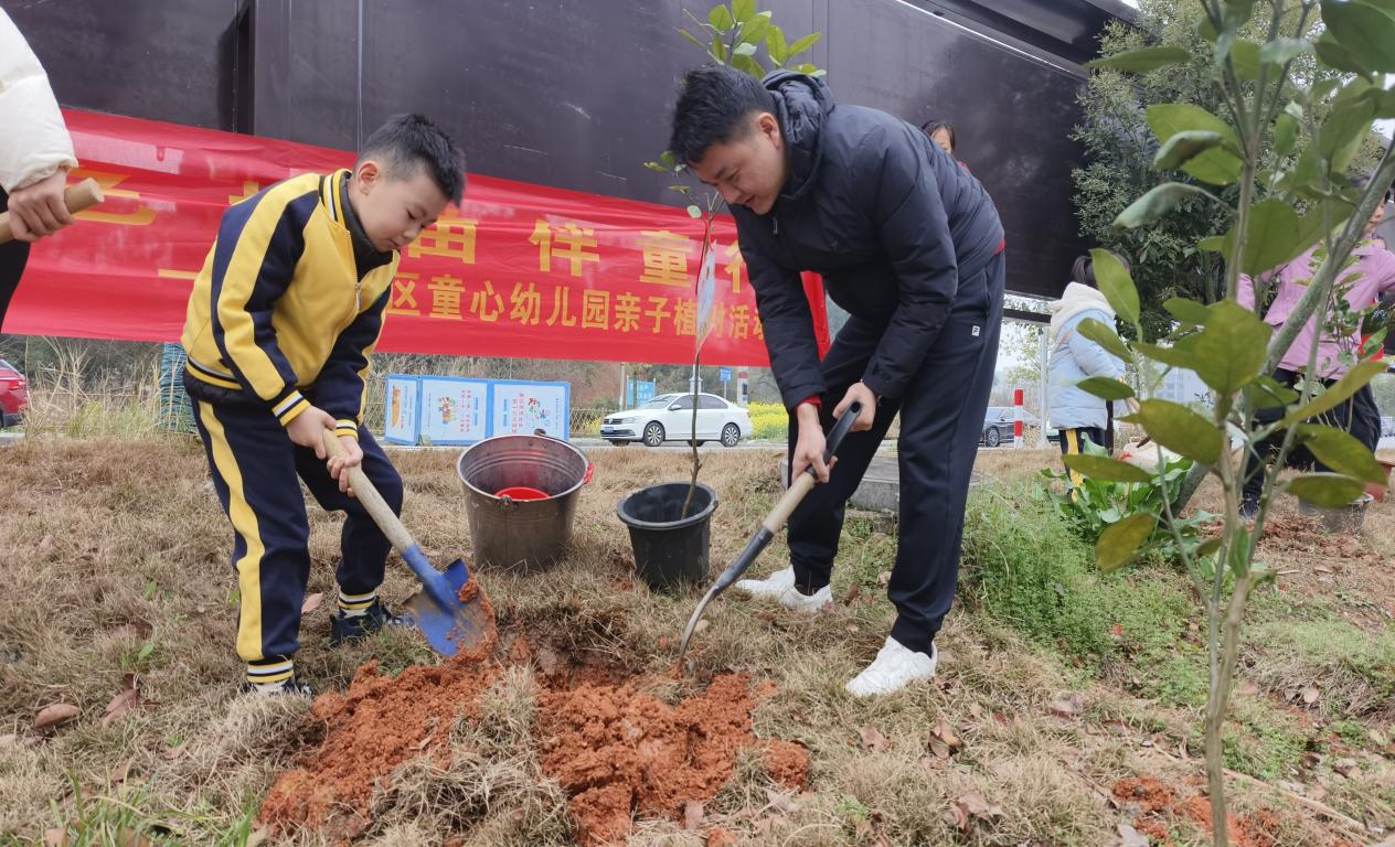 3月11日上午,湖南省衡阳市南岳区童心幼儿园开展了以“红色种子萌新芽,绿色树苗伴童行”为主题的亲子植树活动。