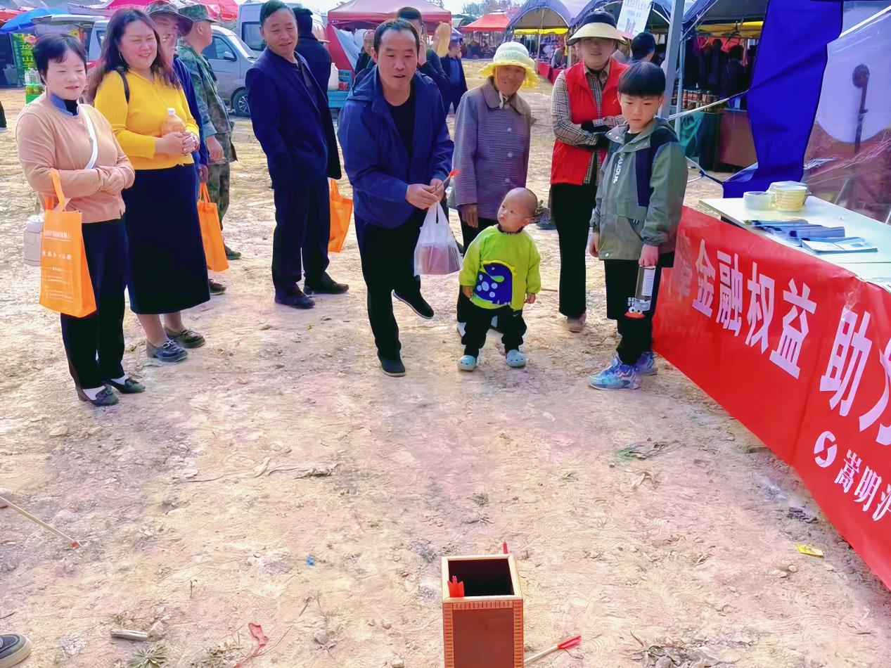 除了传统的宣传方式,本次活动还精心设计了趣味投壶游戏环节。参与者在体验传统投壶乐趣的同时,还需要回答该行工作人员提出的金融知识小问题。问题难度适中,涵盖金融常识、防诈骗技巧等。回答正确即可赢取一份精美的礼品,投中以后还可再次获得小礼品。这个环节吸引了众多群众的驻足,无论是天真烂漫的孩童,还是年逾古稀的老人,都纷纷排起长队,跃跃欲试。小朋友们为了答对问题,认真听工作人员讲解金融知识;老人们则凭借生活经验,迅速答对问题,脸上洋溢着自豪的笑容。现场欢笑声、喝彩声此起彼伏,气氛十分热烈。