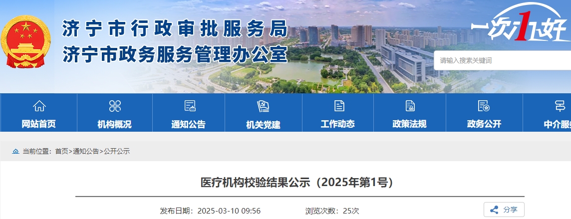 近日,自济宁市行政审批服务局官网发布的《医疗机构校验结果公示(2025年第1号)》一文中了解到,2025年济宁市首批14家医疗机构校验合格。