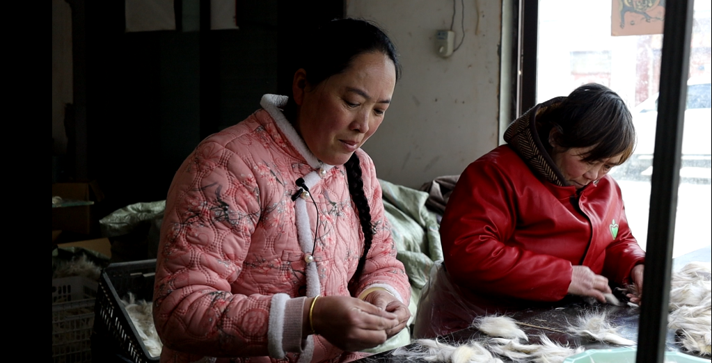 2025年1月,鹿邑县张店镇尾毛加工作坊内工人正在工作。新华社发(马少杰摄)
