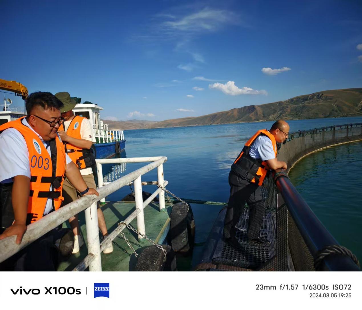图为2024年8月,尼勒克县农信社工作人员<左一、右一>乘捕捞船察看三文鱼养殖情况。也得力·木合亚提摄